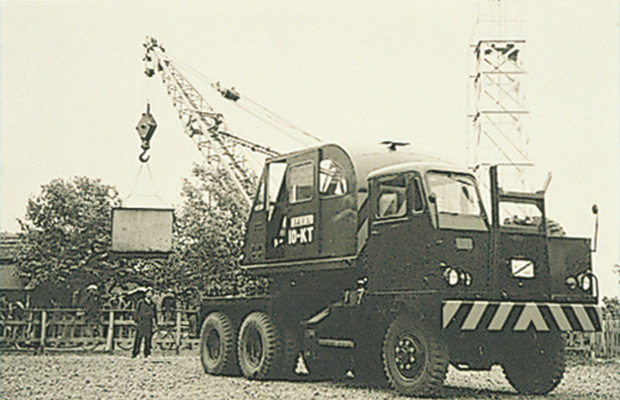 在履帶式起重機改進為輪式起重機的過程中,神戶制鋼作為先驅(qū)者留名于世。1953年完成的日本國產(chǎn)第一號汽車起重機10KT(6T吊裝)、20KT(10T吊裝)交付給警察預(yù)備隊。