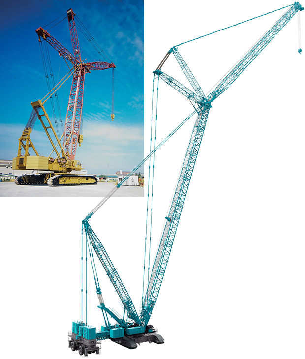 1984年神戶制鋼獨自開發(fā)了全液壓式吊裝450t的履帶起重機7450型,提高了其在海內(nèi)外的知名度。1970年開始,利用其卓越的技術(shù),開發(fā)出行業(yè)領(lǐng)先、吊裝超過300t的神戶制鋼“超大型履帶起重機”,開啟了超級大型起重機的“新時代”。1993年上市的SL13000型是載入史冊的楷模, 800t吊裝使提高產(chǎn)品吊裝能力的設(shè)計思想變成了現(xiàn)實。